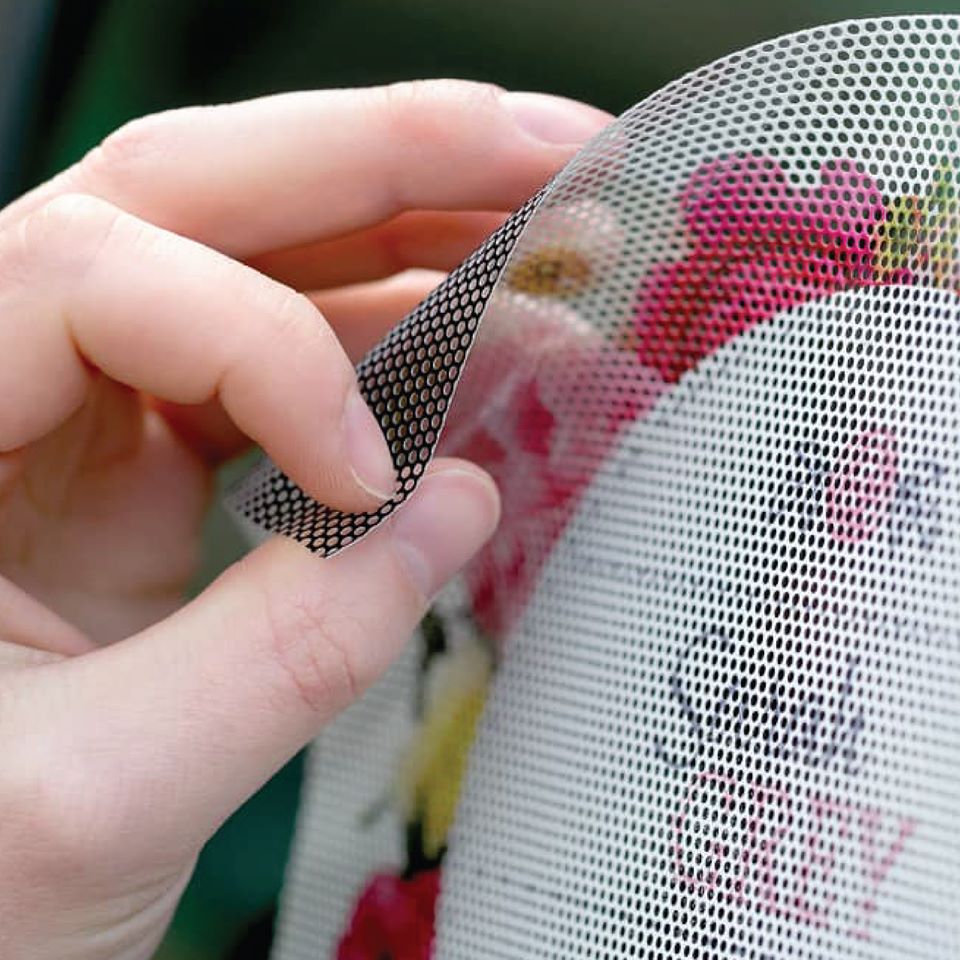 Decal lưới dán bề mặt kính: dán lên kính, nhìn xuyên thấu từ trong ra ngoài, bên ngoài nhìn vào chỉ thấy hình ảnh được in trên bề mặt decal lưới